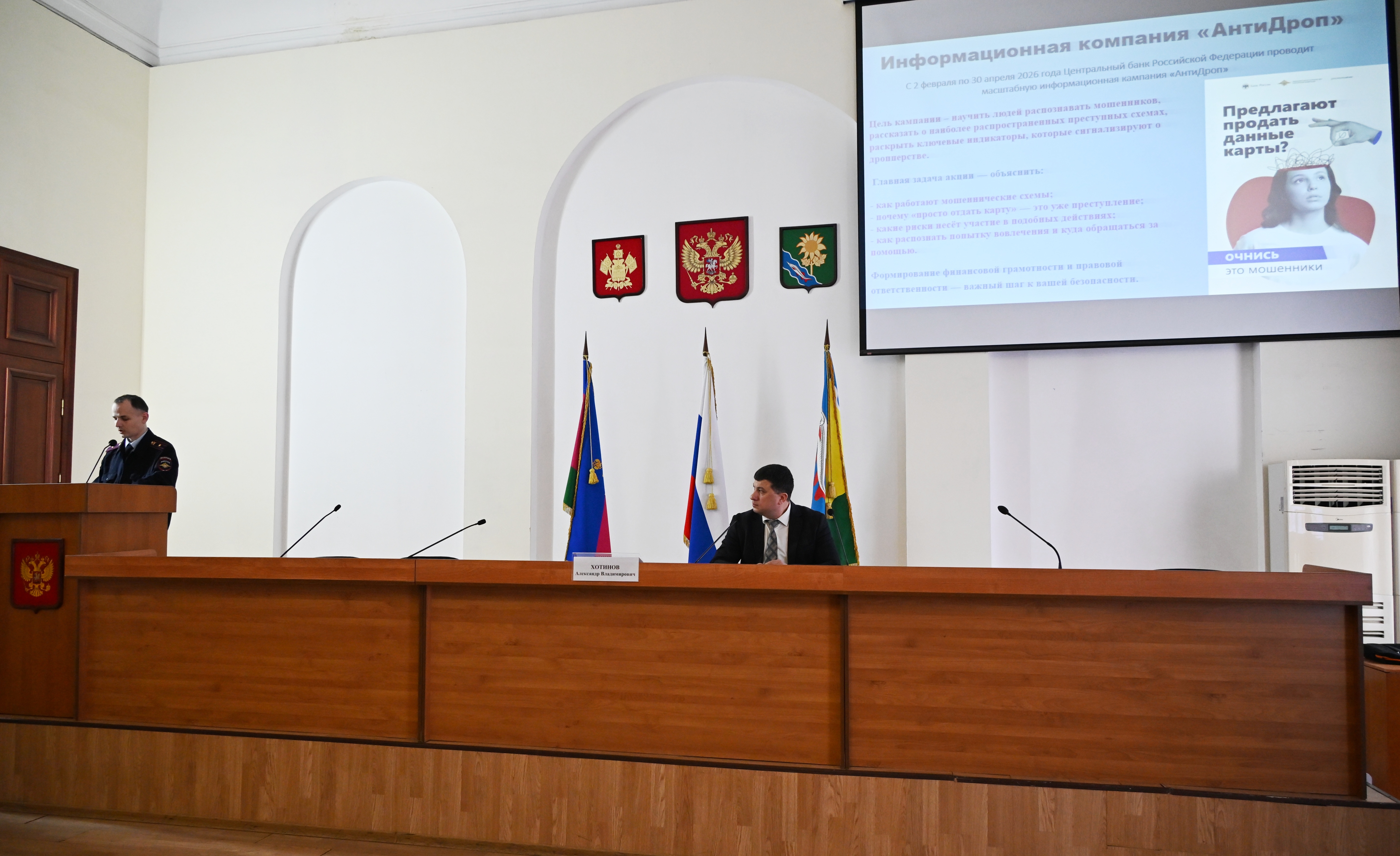 Сегодня в большом зале администрации состоялось методическое занятие, посвященное профилактике преступлений в сфере информационно-коммуникационных технологий. На профилактическое мероприятие, которое провел заместитель главы Ейского района Александр Хотинов, были приглашены представители ТОС, управляющих компаний и ТСЖ, управления социальной защиты населения – все те, кто непосредственно взаимодействует с населением и призваны донести нашим жителям важную на сегодня информацию. Представители отдела МВД по Ейскому району в своем выступлении особое внимание уделили ответственности человека за кибермошенничество, в том числе дропперство.