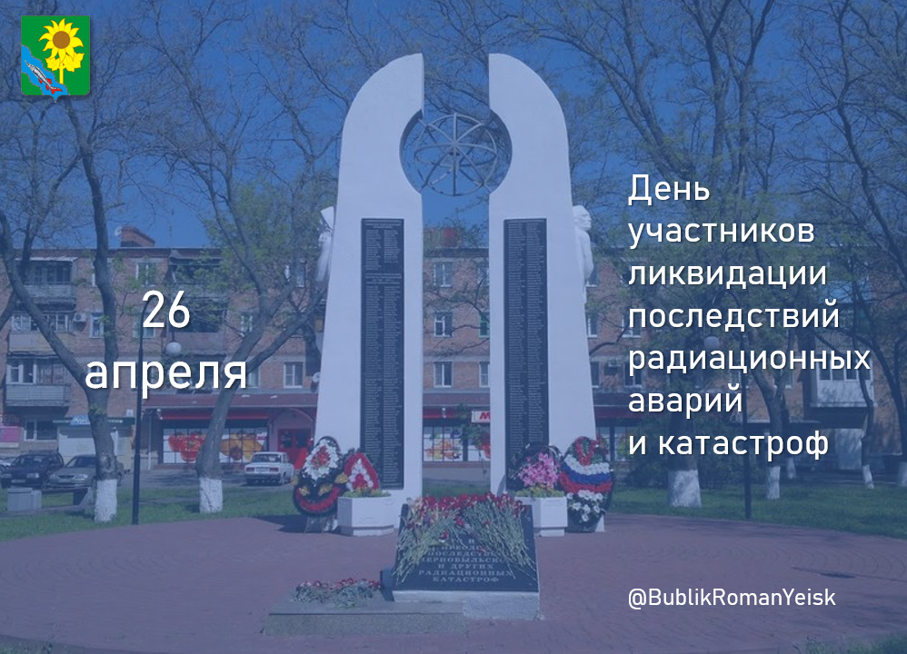 Уважаемые жители Ейского района! Аварии на Чернобыльской атомной электростанции по своему масштабу и последствиям – крупнейшая техногенная катастрофа ХХ века, которая стала для нас суровым испытанием и жестоким уроком! Сотни тысяч человек были привлечены к ликвидации ее последствий и спасению людей. В числе первых, прибывших на ликвидацию аварии, были и наши земляки. Они не пожалели самого ценного – жизни и здоровья ради выполнения своего гражданского и воинского долга. Их героизм является ярким примером самоотверженной любви к Родине.