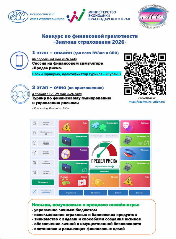 Вас приглашают принять участие в конкурсе по финансовой грамотности «Знатоки Страхования 2026» среди учащихся образовательных учреждений высшего и среднего профессионального образования Краснодарского края в возрасте не старше 25 лет, который стартует 6 апреля 2026 года.