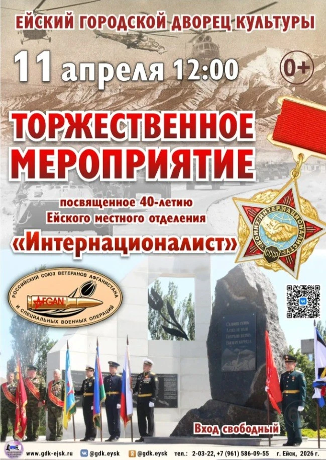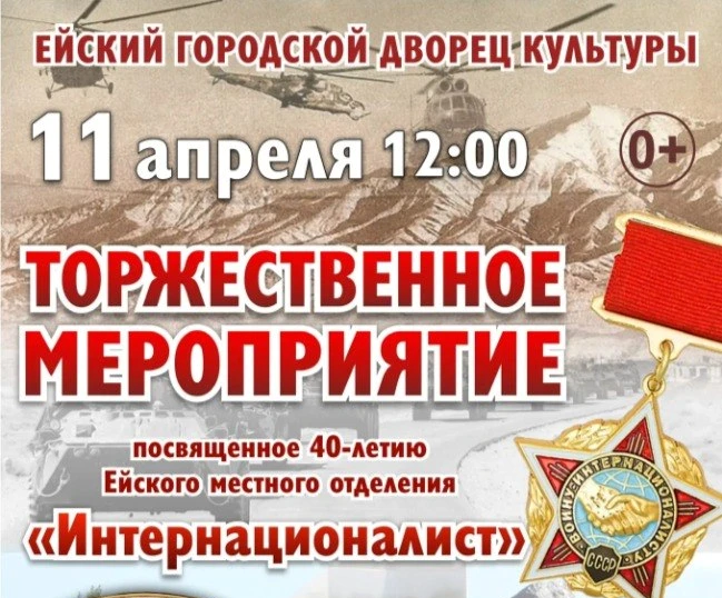 11 апреля в 12 часов в городском дворце культуры Ейска состоится торжественное мероприятие, посвящённое 40-летию Ейского местного отделения «Интернационалист».