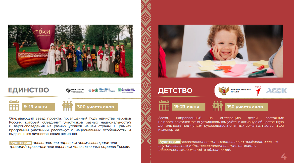 «Детство» – это не просто отдых, это шанс для интеграции, самореализации и развития под руководством опытных вожатых, наставников и экспертов. Это площадка, где каждый сможет найти новых друзей, раскрыть свои таланты и почувствовать себя частью большой и дружной команды.