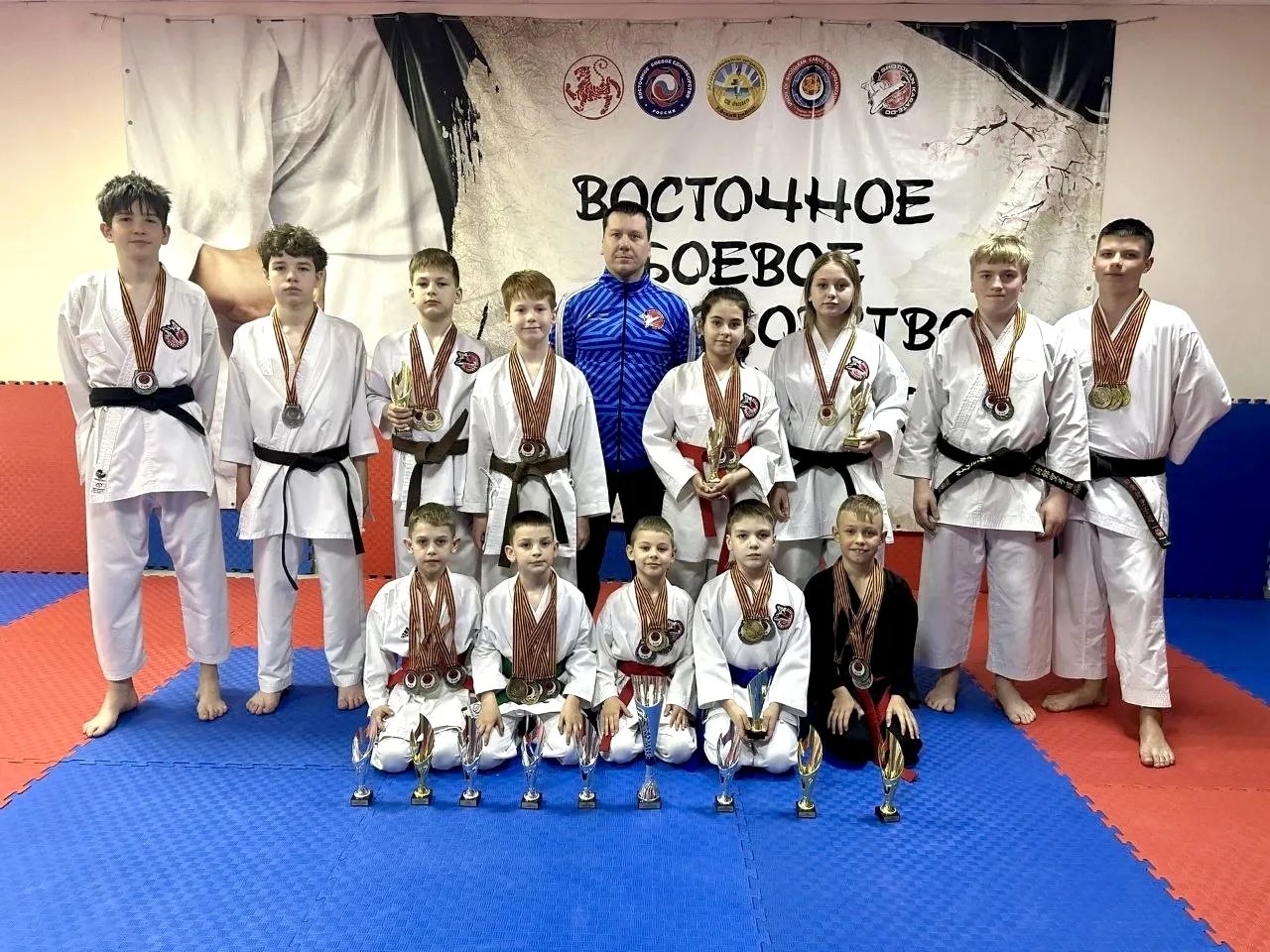 Первое место в командных соревнованиях: Ката-группа 8-9 лет: Усов Матвей, Щербатый Матвей, Кутчиев Артём;