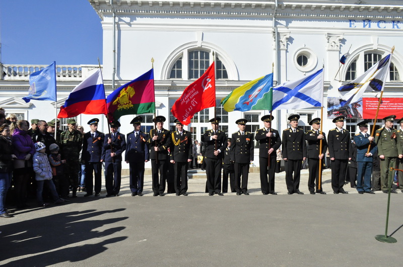 Оставляя за собой клубы дыма, настоящий паровоз военных лет 23 апреля в 10 часов прибыл на железнодорожный вокзал «Ейск». Это его третья остановка в рамках патриотического тура в честь 70-летия освобождения Ростова-на-Дону и 70-летия победы в Сталинградской битве. На перроне с флагами, цветами и шарами агитационный ретро-поезд встречали ветераны Великой Отечественной войны, молодёжь, школьники, ейская общественность.