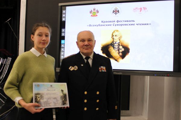 Дипломами победителей Всекубанских Суворовских чтений 2019 года были награждены учащиеся: Гринёв Даниил (МБОУ гимназия № 14 имени Ю.А.Гагарина, г.Ейск); Дубина Евгения и Передистова Юлия (МБОУ СОШ № 22 им. И.Н.Нестерова, пос. Октябрьский); Литвинова Диана (МБОУ СОШ № 19 им. А.В.Суворова, пос. Степной). А также учащаяся МБОУ СОШ № 38 города Абинска Елизавета Жунько – правнучка лауреата в номинации «Боевое имя Ейского района», уроженца станицы Ясенской Героя Советского Союза Ивана Петровича Рыбина.