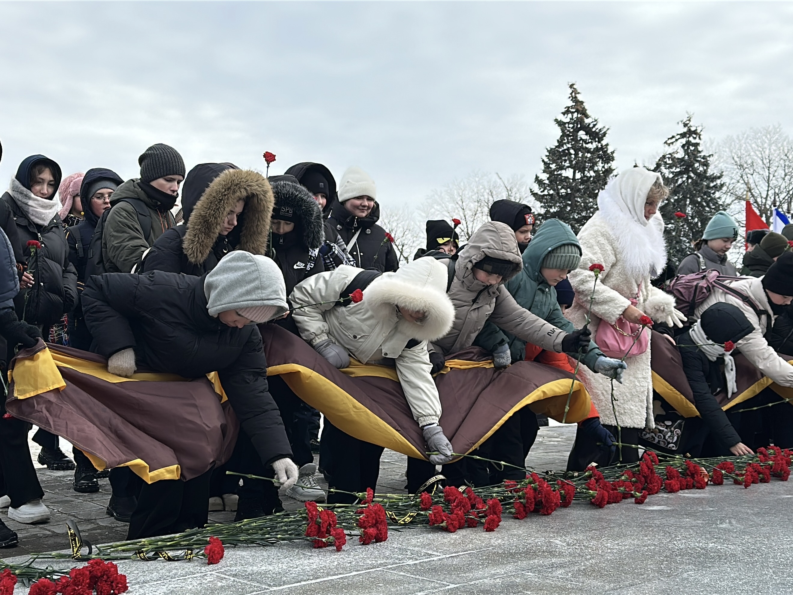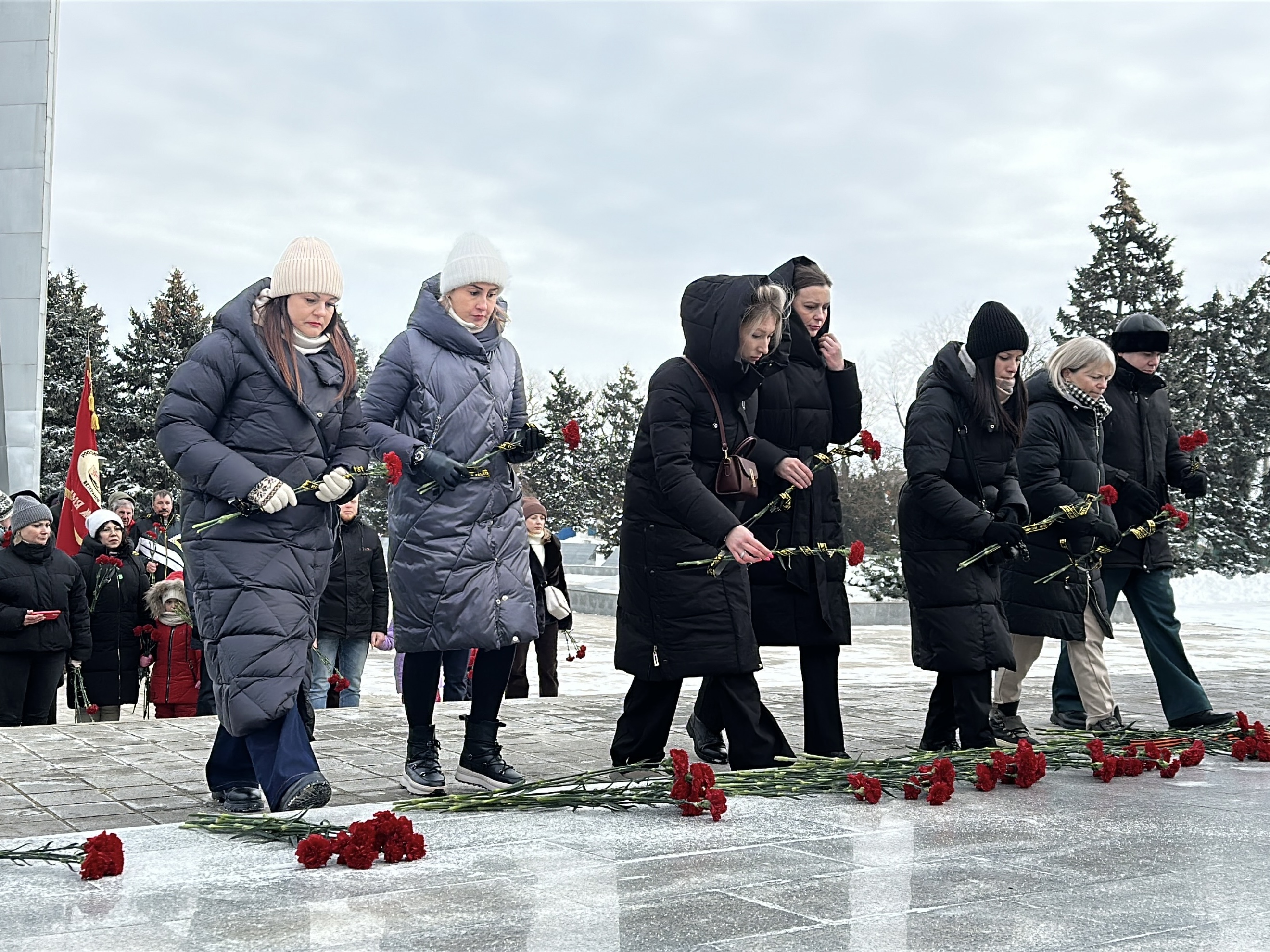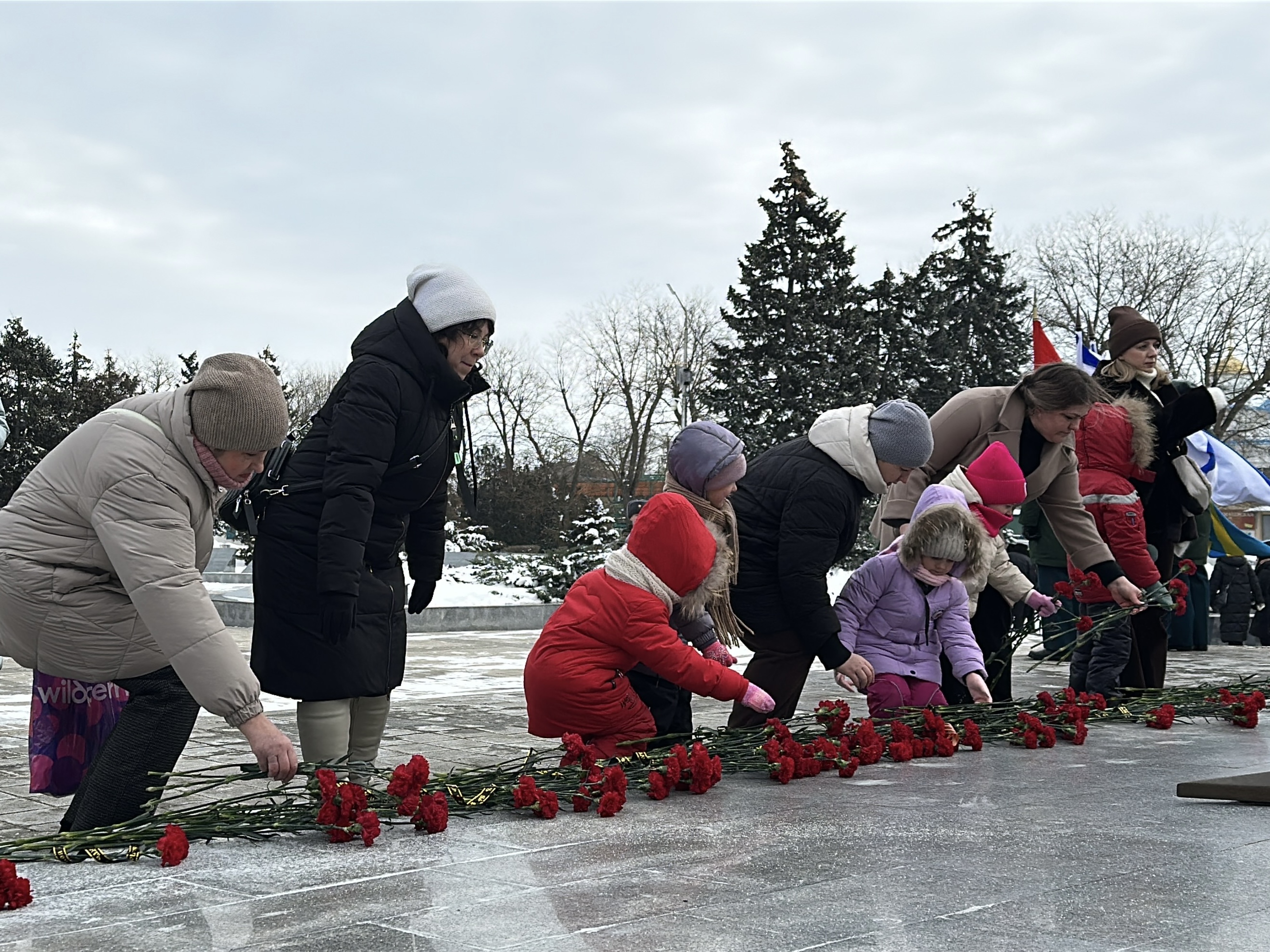 Церемония началась с минуты молчания – безмолвного, но пронзительного выражения общей скорби. В эти мгновения каждый вспомнил своих предков, тех, кто сражался на фронте, трудился в тылу, пережил оккупацию и помог восстановить город после войны. Затем участники возложили к мемориалу алые гвоздики – символ крови, пролитой за свободу, и вечной памяти. Красные цветы легли у подножия памятника, словно немые свидетели той далёкой, но незабвенной эпохи.