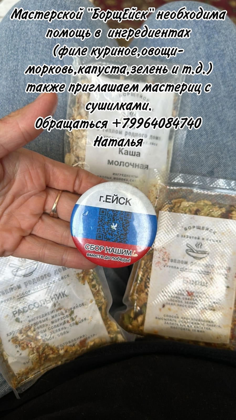 - Дорогие земляки! Нашим бойцам все так же нужна ваша помощь! Тепло ваших сердец, добрые слова и забота дают им силы и волю к победе! Кроме продуктов, нам нужны помощники с электрическими сушилками. Ваша добрая воля и искреннее желание помочь очень важны нашим ребятам «за ленточкой»! Если вы хотите помочь накормить бойцов, звоните по телефону: 89964084740, – обращаются к землякам волонтеры мастерской «БорщЕйск».