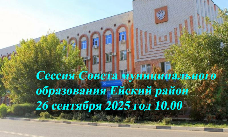 26 сентября 2025 года в 10.00 в административном здании по адресу: г.Ейск, ул. Красная, 59/5, 2-ой этаж, зал заседаний, кабинет 201, состоится очередная сессия Совета муниципального образования Ейский район 7-ого созыва.