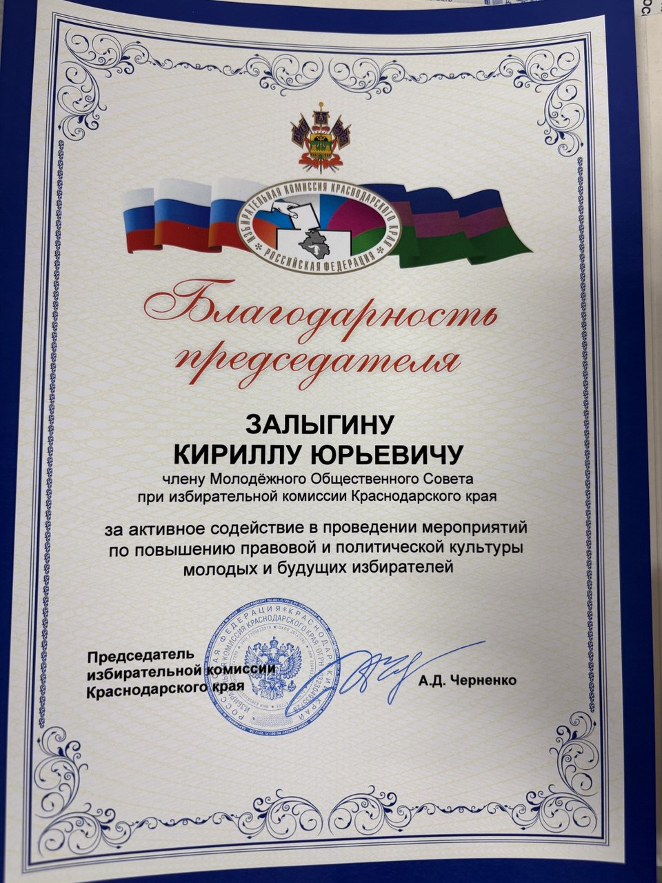21 января 2026 года в режиме видеоконференцсвязи состоялось заседание молодёжного общественного совета при Избирательной комиссии Краснодарского края под председательством Алексея Дмитриевича Черненко. В студии муниципалитета приняли участие председатель ТИК Ейская районная Татьяна Чернодырка и председатель молодежного общественного совета при ТИК Ейская районная Кирилл Залыгин. На заседании подвели итоги работы всех молодежных общественных советов при избирательных комиссиях за 2025 год. Дана высокая оценка работы молодежного общественного Совета при ТИК Ейская районная, по итогам года Совет занял 1 место. На заседании Совета Благодарностью председателя избирательной комиссии Краснодарского края Алексея Дмитриевича Черненко был награжден Кирилл Залыгин за активное содействие в проведении мероприятий по повышению правовой и политической культуры молодых и будущих избирателей.